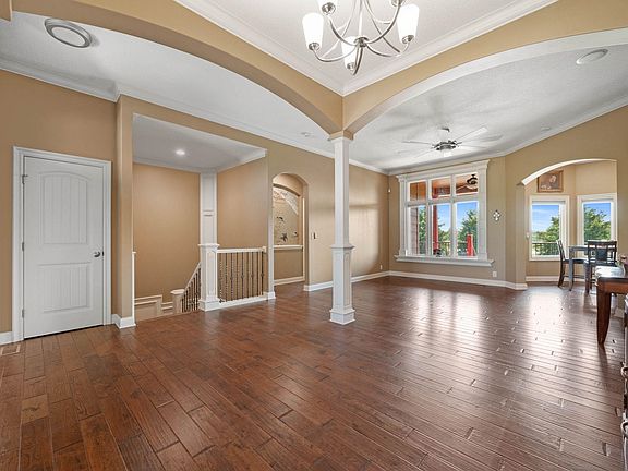 Welcome Home! This fantastic 5 bed, 4 bath home truly has it all! Featuring 3680 sqft of living space on a half acre corner lot in the desirable Goddard Eisenhower School District. From the stunning entrance to the classy primary suite, every detail shines. Mission style windows and french doors open from the bedroom onto a private deck. The suite also boasts an incredible walk-in closet with custom built-ins and a window for natural light, a gorgeous walk in tiled shower, jetted tub, marble countertop and radiant heated tile flooring. The home is filled with character, featuring beautiful white enameled woodwork, crown moulding, oak plank flooring and a wainscoted stairway that elevates the formal living and dining areas. The hearth room, with hardwood floors, a cozy gas fireplace, and a breakfast nook, flows seamlessly into the kitchen. This kitchen is truly a TEN, offering granite eating bar, ample knotty maple cabinetry, walk-in pantry, ceramic tile flooring and a vented range hood, adding a beautiful decorative touch as well. The fully finished walk out basement is designed for entertaining, with a massive family room, wood look tile flooring, and a stunning wet bar complete with knotty maple cabinetry, sparkling granite countertops, stainless steel apron sink, fridge, microwave and even a garbage disposal. You will also find a sm!all bonus office space and 2 spacious bedrooms downstairs. One bedroom features a large walk in closet, en-suite bathroom with granite countertops and a large jetted tub. Perfect for guests or family seeking extra privacy. Additional highlights include a main floor laundry room with a built-in coat rack and bench, a high efficiency furnace and separate on demand water heater that supplies the primary suite's jetted tub. The garage doors are equipped with high lift garage door openers. Outside enjoy the beautiful stonework on the front of the home, smart siding for low maintenance living, sprinkler system, a fully fenced back yard, basketball or sport court, large storage shed with electricity and a large covered composite deck. Community perks include a community pond and pool, plus No Specials, making this home an exceptional buy! If you love what you see, schedule your private showing today!
