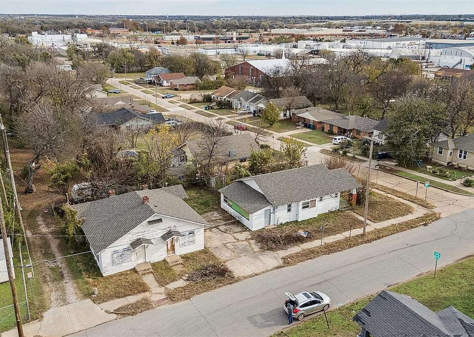 Duplex and single-family home on a corner lot near new construction and close to downtown OKC. The first set of photos shows the duplex, which features two 1-bedroom units with hardwood floors—both in need of full renovation. The single-family home, shown next, is a 2-bedroom (potential 3-bedroom) that also requires a complete renovation. A new roof was installed in 2023. An aerial photo is included to highlight the property's proximity to nearby new construction. This is a great opportunity for a homeowner or investor. Buyer to verify all information. AS-IS. Seller is an Oklahoma real estate broker #161124. Willing to sell as a package deal with MLS #1204192