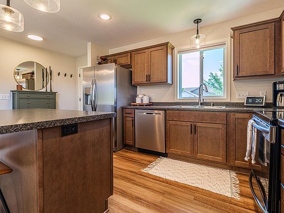 Check out this stunning 3-bedroom, 2-bathroom gem nestled on a corner lot on the edge of town! This three level split home was built in 2020 and has since had custom upgrades including but not limited to: a brand new, expansive poured concrete patio—perfect for entertaining friends and family, updated electrical (some fixtures, a ceiling fan, added lighting above the showers, and dimmers in main areas), and a wood slat accent wall in the living room.