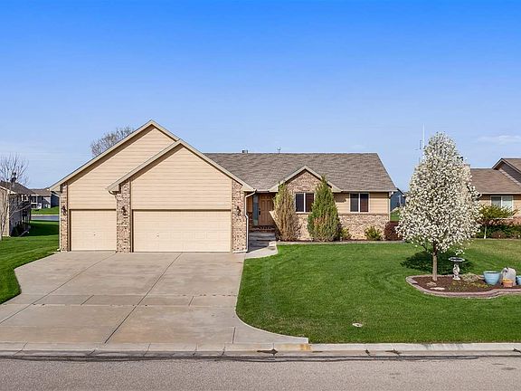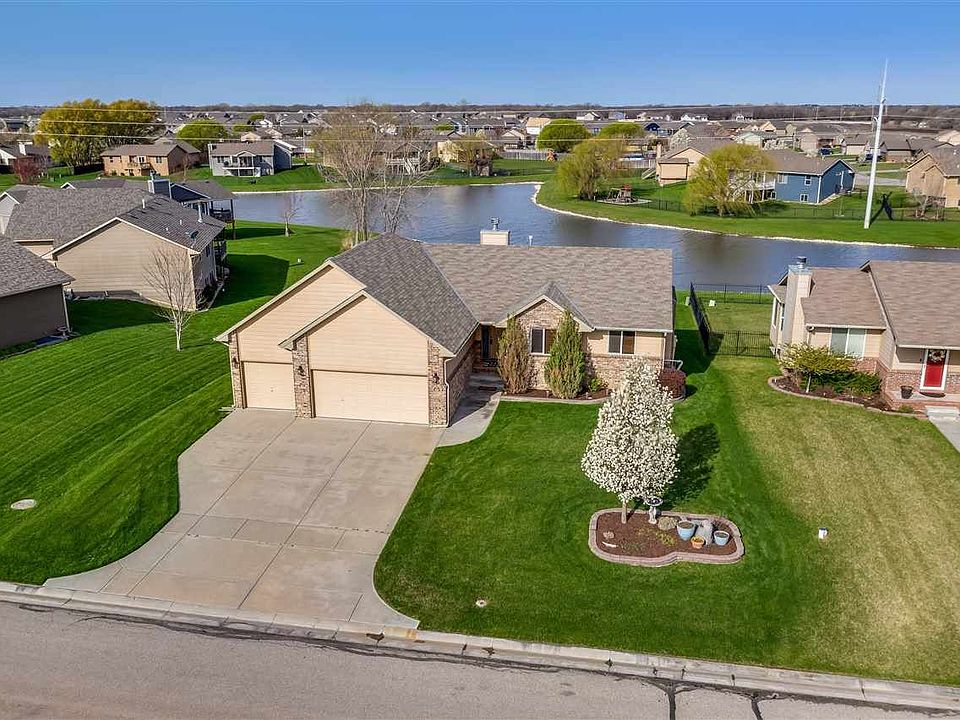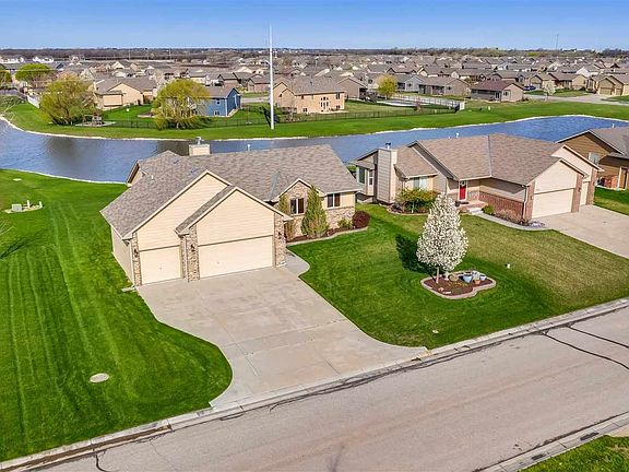Gorgeous Lake Lot Ranch Style Home Now for Sale in West Wichita in the Silverton Addition! 4 bedrooms, 3 full bath and spacious 3 car garage all conveniently located on a quiet cul de sac! Maize schools, excellent home, excellent location. Nice warm colored cabinetry and trim, neutral colored flooring and walls. Good sized kitchen with island, pantry, under cabinet lighting, vaulted ceilings, stainless steel and black appliances. Dining room opens to covered deck with the most phenomenal lake view and breathtaking sunsets. You'll lower your blood pressure living here, that's for sure!! There is also an attractive and functional lower level stone patio with built-in fire pit and another angle of the spectacular lake views. Home comes complete with a lush manicured lawn, irrigation well, sprinkler system and even has drip line hoses for the flower beds as well as some of the free standing flower pots. Living room features a stone-faced gas/wood fireplace with two windows on either side. Three bedrooms on the main level offer flexibility for all lifestyles and family dynamics. The master suite is a retreat offering more water views. Master bath features a custom tiled shower with glass shower door, transom window above shower, unique oversized square vanity sink, quality hardware and fixtures and a spacious walk-in master closet with built-in shelves. Main floor includes two more bedrooms, another full bath with transom window and main floor laundry room between kitchen and garage. Lower level is ready for you to entertain and enjoy family time! It offers view out windows and loads of natural light, a huge family/recreation room with beautiful built-in recessed floating wood shelving and a nice wet bar with mini refrigerator. Downstairs, you will also find a sharp looking 3rd full bath with nice fixtures and shower, a 4th bedroom and an unfinished room with built-in shelves - perfect as a work room, exercise room, hobby room or storage. A few more features and upgrades include; 4 new windows in 2019 (above kitchen sink, two front bedrooms and sliding glass door), TV and bracket in garage, TV bracket in family room, oil rubbed bronze hardware, brushed nickel lighting, battery backup sump pump, high efficiency furnace, new A/C coil in 2018, new hot water heater in 2018, brand new kitchen refrigerator in 2019 and Radon mitigation system installed 2019. Don't miss this opportunity to enjoy all the benefits of living on a lake lot- it's so peaceful and serene. These homes don't last; hurry to schedule your showing appointment today!