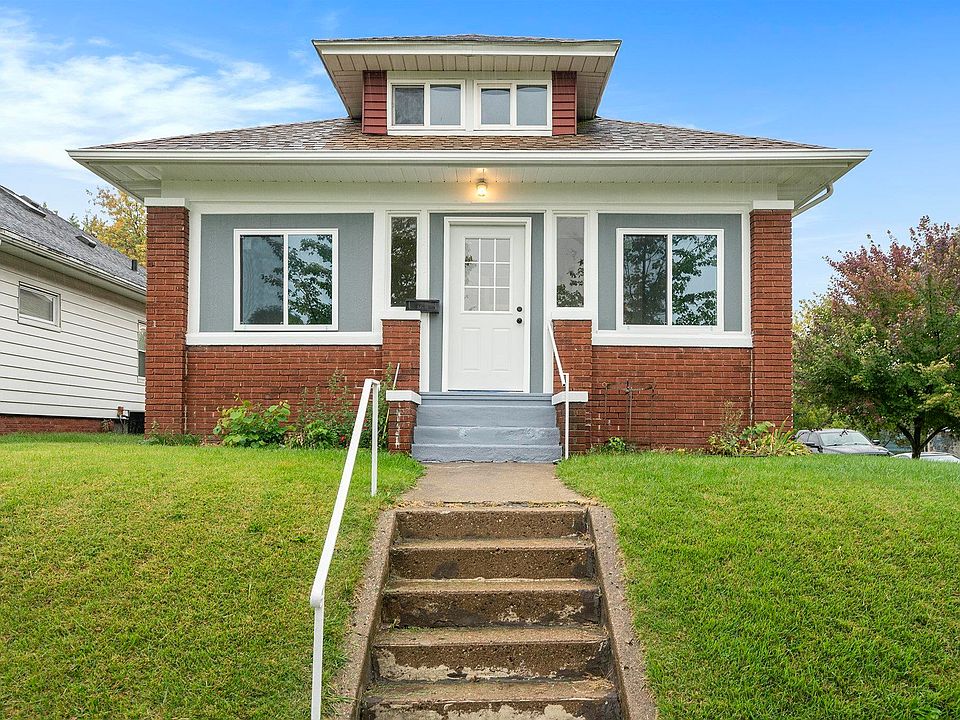 This beautifully updated brick bungalow is ready for new owners! With 2 main level bedrooms and the third in finished attic, this home feels much bigger than it looks. The enclosed front porch features wrap around windows and will be perfect for morning coffee or evening drinks. The living area flows into the formal dining area and to the brand new kitchen. With breakfast bar, quartz countertops, and a stainless steel appliance package, this kitchen will satisfy the chef in your family. The bathroom features floor to ceiling ceramic tiled shower with matching vanity. The upstairs, with 6 foot ceilings, would make a great area for the kids. The back yard is fully privacy fenced and has a concrete patio area. The concrete block garage offers off street parking or storage along the paved alley. Basement is clean and dry and with new furnace and AC in '24.