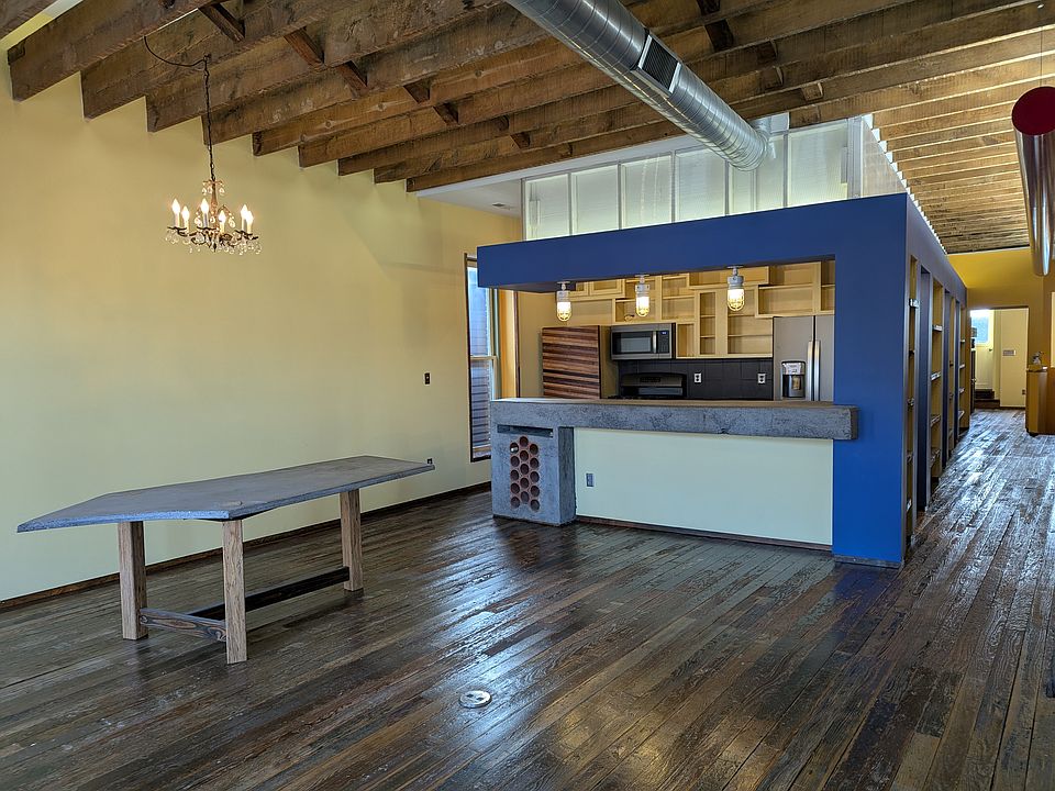 10 to 12 foot ceilings, with exposed brick. Large walk-in closet, curbless shower and separate tub. Private entrance and laundry room with floor sink and extra space for storage. Custom concrete counters, vanities and built-ins, built in wine rack, and lots of shelving for books and art. Dining table seats 4-10 easily.
