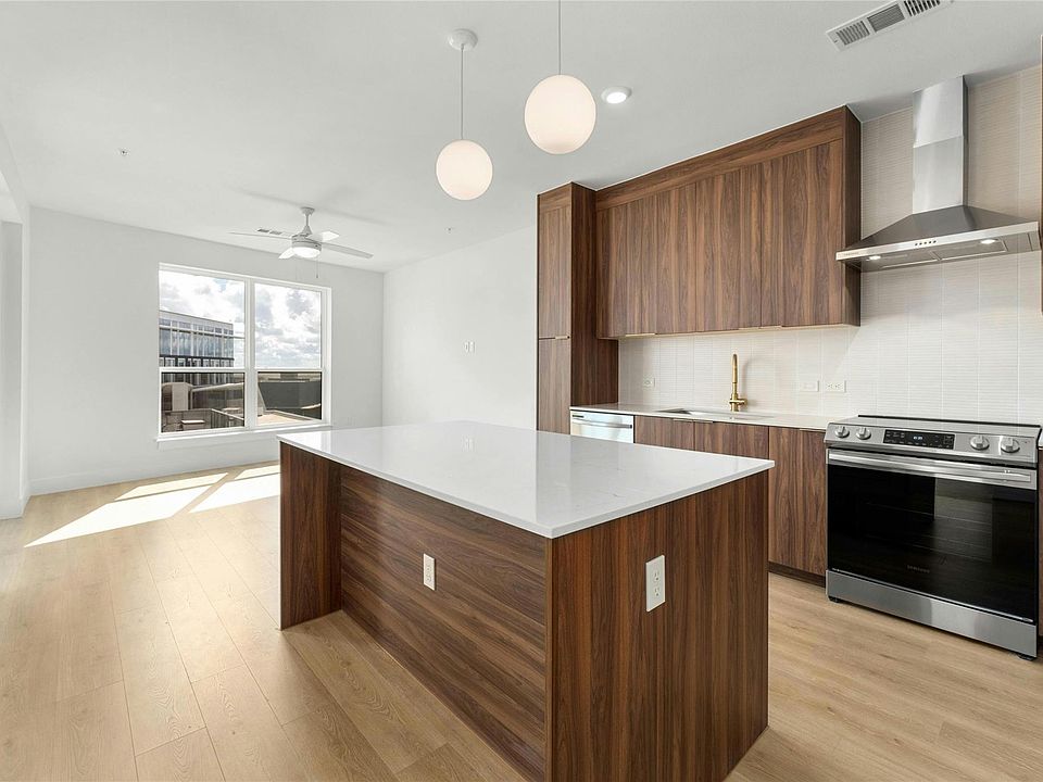 Looking for a walkable neighborhood surrounded by nature while being in the core of Austin? Look no further than Parkside at Mueller! This top floor 1 bedroom has a welcoming open floorplan with a kitchen at the heart of it all. The warm tones of the walnut finished cabinets complimented with brass hardware really make the Carrera marble-style quartz countertops shine! A kitchen island makes for the perfect centerpiece of storage and functionality. A full stainless steel Samsung appliance package included makes this a move in ready dream. The living room is filled with natural light from the oversized windows showcasing the Mueller neighborhood. Escape to the bedroom for relaxation while maintaining that open feel from the abundant windows. With so many amenities to enjoy within the building, you'll never want to leave! Get a workout at the fitness center with Peloton Bikes, or lounge in the Clubhouse. Grab a cabana at the resort style pool while you grill at the outdoor kitchen. Then wrap up by the firepit on the rooftop terrace featuring breathtaking views of Mueller Lake and downtown Austin! When you're ready to head out, you're surrounded by so many of Austin's best restaurants and entertainment right at your doorstep. This condo isn't just a home -it's a lifestyle.
