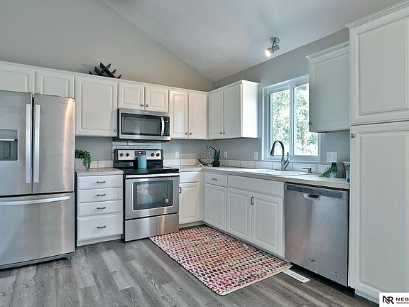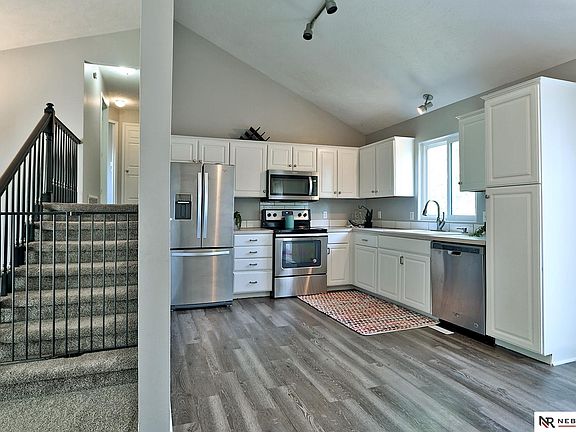 Updated white kitchen cabinets and trim with fully fenced yard, updated hallway bathroom vanity & flooring. Newer carpet & black trimmed stair railing. The home has all new vinyl windows, freshly painting on the interior and exterior of the home. New water heater and painted deck with large patio entertainment space and a full wood privacy fence. Freshly trimmed trees and all kitchen appliances are included. New white kitchen sink with LVP flooring, this home is clean and ready for it's new owner. It's conveniently located in the Elkhorn school district with walkable shopping and amenities. Neighbor park & close walking trails for the active outdoors person including the ever close Flanagan Lake. This street is not a through street which limits traffic from the neighborhood and this house could just be the perfect house for you.