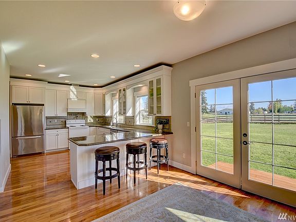 Beautiful colonial-style home on 5 level, prairie acres, with 4 bedrooms, 2.5 baths, hard wood floors, high ceilings, granite counters throughout, and custom finishes. 1500 sf open span outbuilding, insulated, with two garage-type doors and concrete floor would make a great shop or barn. 3/4 fenced. Nice area of similar 5-acre horse properties. Gorgeous Mt. Rainier view! Easy access to I-5 and Olympia, Centralia or Tenino.