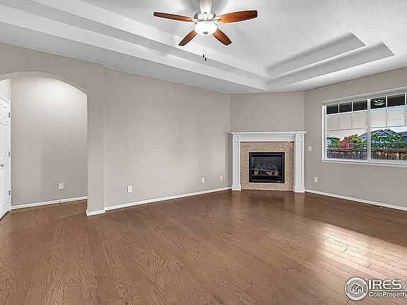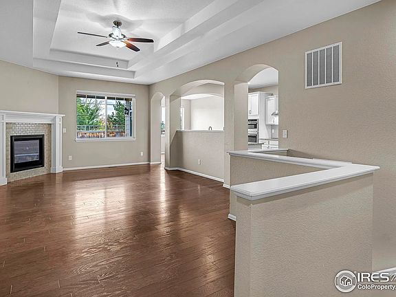 Inviting Living Room Cozy gas fireplace, open flow to the dining area, and backyard access for easy indoor/outdoor living.
