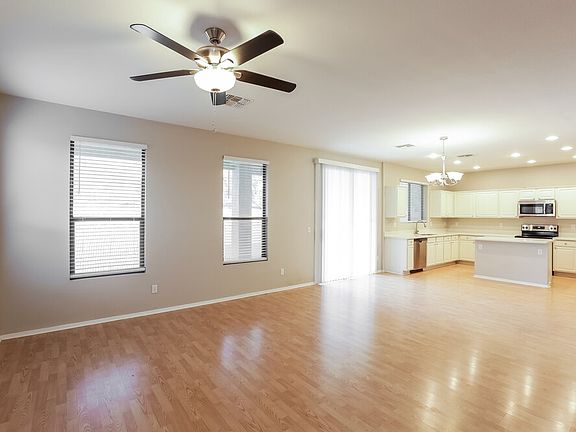 This three-bedroom, two and a half-bathroom rental home in Surprise boasts Spanish architecture and modern features. Luxury vinyl plank floors and a ceiling fan offer a comfortable gathering space in the living room. The first floor's open floor plan continues into the dining area, which offers a pretty chandelier and a sliding glass door for accessing the backyard's shaded patio. In the kitchen, a center island and two walls of gleaming white cabinets facilitate meal prep. The kitchen also boasts stainless steel appliances and recessed lighting. You'll sleep well in the master suite thanks to its ceiling fan and walk-in closet. The bathroom includes dual sinks and tiled floors. Tour this renovated rental home with a fenced-in yard soon.