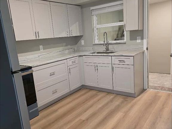 Modern light fixturesShaker-style cabinetsQuartz countertopsStainless-steel appliancesConvenient laundry room