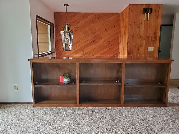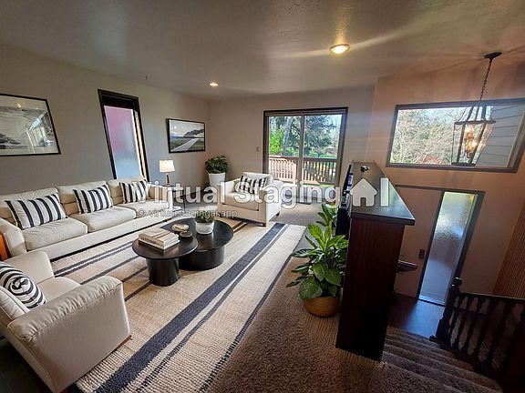 You'll enter up a half flight of stairs into a beautiful dining room and living room. The living space features built-in shelves, wood accent walls, and a sliding glass door that opens to a front deck, a perfect spot to enjoy your morning coffee.