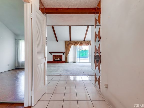 Step inside to find an elegant entryway featuring tile floors and a crystal chandelier that sets the tone for the rest of this delightful home. The spacious living room offers a cozy brick fireplace, vaulted ceilings with exposed beams, plush carpet, and sliding glass doors that open to the lush backyard — the perfect blend of comfort and style.