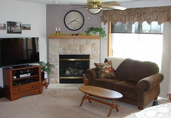 Immaculate first floor condo with southern exposure with outdoor patio. Two bath, two bedroom with two-car attached garage. Master bedroom with ensuite master bath and large walk-in closet. Fireplace for those cozy nights. Very nice in-unit laundry. New carpeting and more. Come see for yourself what a nice condo looks like!