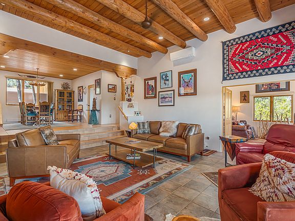 Enter the hand carved front doors and be greeted by dramatic views straight away. From here, step into the grand salon with soaring ceilings, a kiva fireplace and stately hand-troweled plaster. The dining room features a drop ceiling and recessed lighting for the most intimate ambience. You’ll be serving your happy guests in style from the updated chef’s kitchen –featuring Silestone quartz countertops, stainless appliances, a playful handpainted tile backsplash, and a sleek modern design. Almost every room in the home has house outdoor access for that seamless indoor-outdoor living. The views from the portal will be sure to impress: city lights at night and Sangre De Cristo-facing sunsets for that gorgeous Santa Fe color palette. The generous primary suite has its own kiva fireplace, outdoor portal, and a sumptuous bath – with oversized pebble shower, dedicated water closet, deep-soaking tub and dual sinks. The two guest rooms share a large full bath. Recent upgrades (2022) include a new foam and gravel roof with a 10-year warranty, plaster walls in the main living areas, latilla ceilings and 40 new recessed lights in dining and guest rooms, a new alarm system, and an outdoor kiva fireplace flanked by bancos. The oversized 2-car garage has direct entry into the kitchen and dedicated laundry area for easy access. With plenty of storage, this home is perfect for a primary residence, or make it your Santa Fe getaway! Don't miss this opportunity to own all the best Santa Fe has to offer! Schedule a showing today!