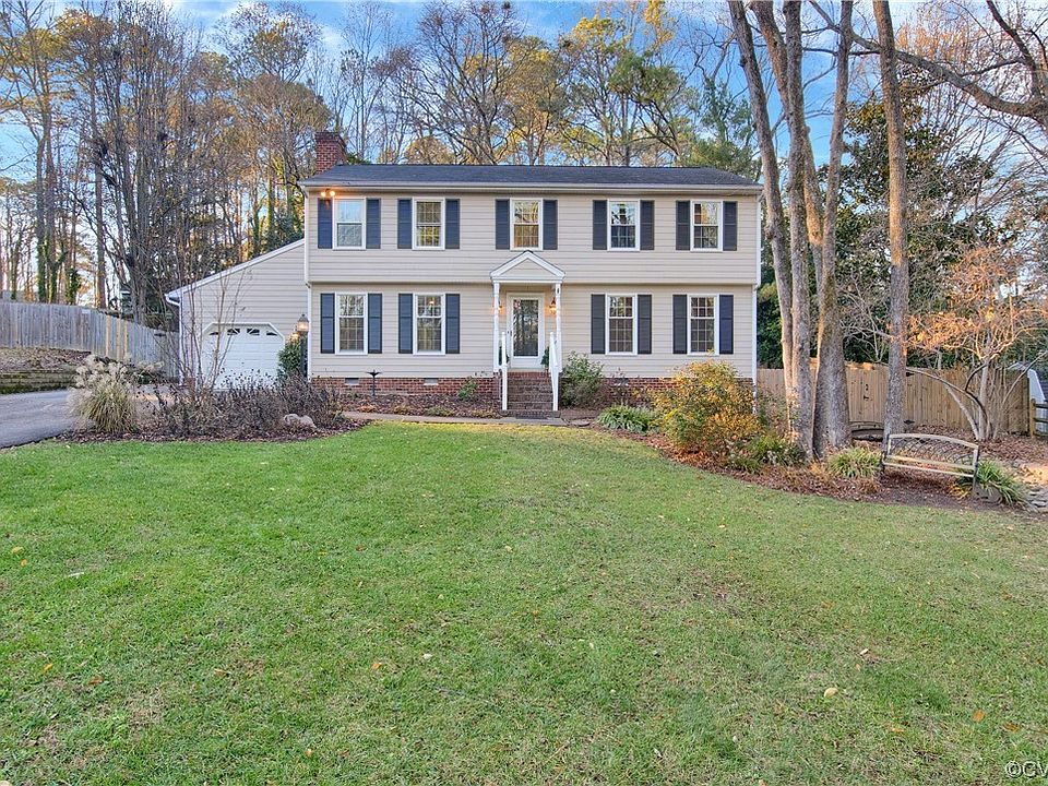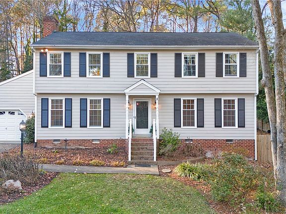 Welcome to 1702 Windingridge Place in the sought after Gayton Forest neighborhood of West End Henrico. This 4-bed, 2.5-bath home with an attached garage has been updated with newer hardiplank siding, newer roof, and energy-efficient vinyl windows, plus a new water heater. Enjoy privacy on the cul-de-sac, a fenced backyard, and a detached storage shed on a lot backing up to HOA wooded land. Inside, the foyer features tile flooring and elegant molding. The family room boasts a brick wood-burning fireplace and recessed lighting. The kitchen offers refinished cabinets, new tile backsplash & recessed lighting. The dining room opens to a two-tiered back deck. The formal living room offers flexibility as an office or playroom. The first floor includes a half bath and laundry room for convenience. Upstairs, the primary suite features hardwood floors, a walk-in closet, and an ensuite bath with a tiled shower and granite vanity. Three additional bedrooms have hardwood floors, and the hall bath impresses with a tile surround tub/shower. Experience classic charm with modern amenities in the heart of Gayton Forest.