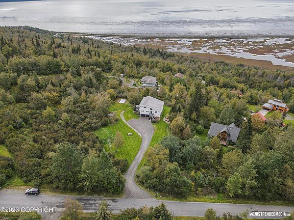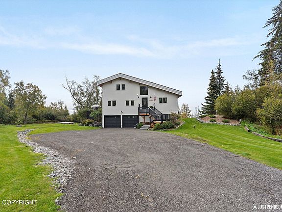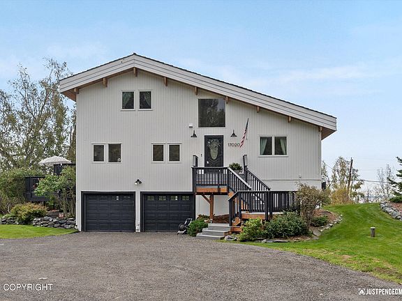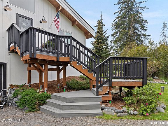 This home is uniquely Alaskan! Enjoy night after night of jaw dropping Northern Lights while being surrounded by wilderness and commanding city, inlet, & mtn views. All within minutes to the nearest grocery store. Soaring T&G ceilings, walls of windows leading out to an expansive SW new Trex deck. Gourmet kitchen w/pantry and coffee bar plus a very large dining room with a double sided fireplace.1BR and BA on main floor. Upstairs is the master ensuite retreat, office, BR, BA and more sweeping views.Completely renovated walkout basement w/open fam room, 2BR, BA, laundry with 2 WD's, gas stove. Many upgrades that include new carpet, LPV, 2 furnaces, central air conditioner, hot water heater, all 4 bathrooms newly renovated with overflow proof toilets, blinds in the whole house and black out curtains in the bedrooms. Newly surfaced driveway. If you follow maps, it will give you directions to go on a very steep road. Please follow included directions to the property instead. S on Seward Hwy to Rabbit Creek Rd. Exit. Turn L on Old Seward Hwy to Rabbit Creek Rd. R on Golden View Dr. R on E 164, R on Woodridge, L on Virgo, L on Belarde. Home is on the R