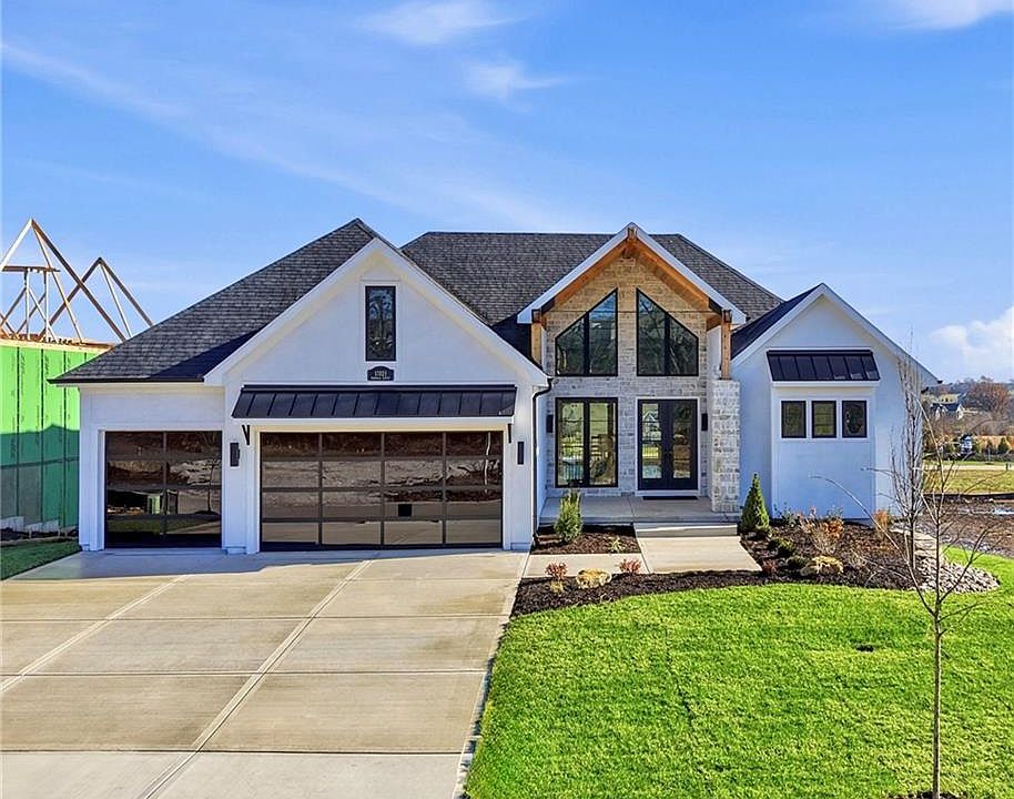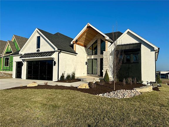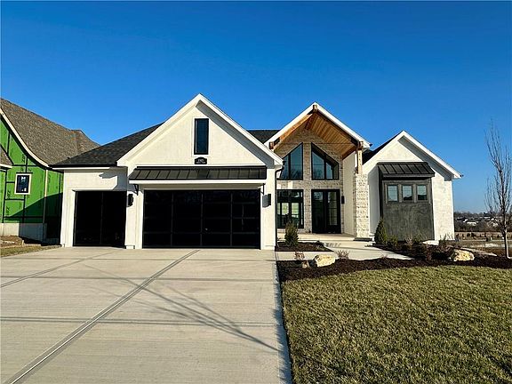 READY!! You'll love this sought after Gunnison REVERSE by JFE HOMES with a X-Large sunken patio on Lot #182 in a private cul-de-sac. This ideal floor plan is a popular one with spacious main floor living at just over 2000 square feet on the main floor and a full finished walkout lower level for a total of 3596 finished square feet of living space. BONUS WASHER AND DRYER already installed by the BUILDER! SO many extra features in this home like the pocket office, elegant glass doors in the kitchen, large prep pantry, free standing tub, pull down bars in primary closet. This beautiful home is an award winning plan and loaded with upgraded features at this price. The BRAND NEW modern look includes extra windows, vertical wood accent posts with real stone trim. Built on a walkout/up lot with an AMAZING OUTDOOR sunken patio. MUST SEE! This home also features a covered deck with fireplace, double sliders that open from the great room providing plenty of light, a large great room with high ceilings and an oversized kitchen with island prep style walk in pantry. The perfect walkout lower level is finished and has a spacious living room with wet bar, TV accent wall, and two additional bedrooms and a fitness room. Still plenty of room for basement storage. Century Farms has a spectacular club house with a farmhouse twist ideal for neighborhood gatherings or private parties. It features a small prep area, fireplace, pub tables, reading loft and a fitness center. Large resort style swimming pool. There are plenty of neighborhood activities with a fire-pit, two pickle-ball courts and a basketball hoop, farm themed animal kids play area, wildflower walkways and a community garden. Century Farms is conveniently located near the brand new Bluhawk shopping center, Heritage Park, the Johnson County Trail system and the Overland Park Arboretum. Come join the fun in Century Farms, a unique one of a kind upscale new home community in Overland Park. BLUE VALLEY SCHOOLS