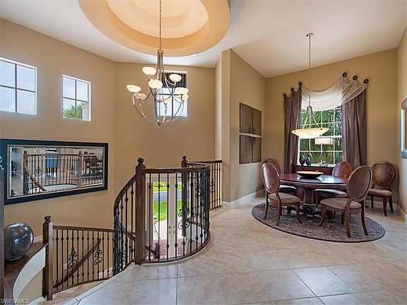 Stunning 2nd floor coach home residence! The grand foyer entrance is accentuated by a spiral staircase leading up to the comfortable family room overlooking phenomenal lake views through the over-sized sliding glass doors. Serve family and friends special occasion meals in the tasteful formal dining room. Rich wood cabinetry, tumble marble back splash and granite topped surfaces are found in the open kitchen overlooking the breakfast nook and family room. The spacious den provides an ideal work space or intimate gathering area with family and friends. Retreat to the master suite featuring expansive windows with access to the screened lanai. The relaxing master bathroom offers his and hers vanities, a large soaking tub and separate walk in shower. The expansive sliders encapsulating the formal living room allowing delicate sunlight to flood the space with views of the shimmering lake beyond. Enjoy tropical paradise while entertaining guests with a surround sound system and outdoor speakers on lanai from the spacious screened lanai. This impressive home has all the amenities one might desire to enjoy the maintenance free golf course lifestyle in Mediterra.