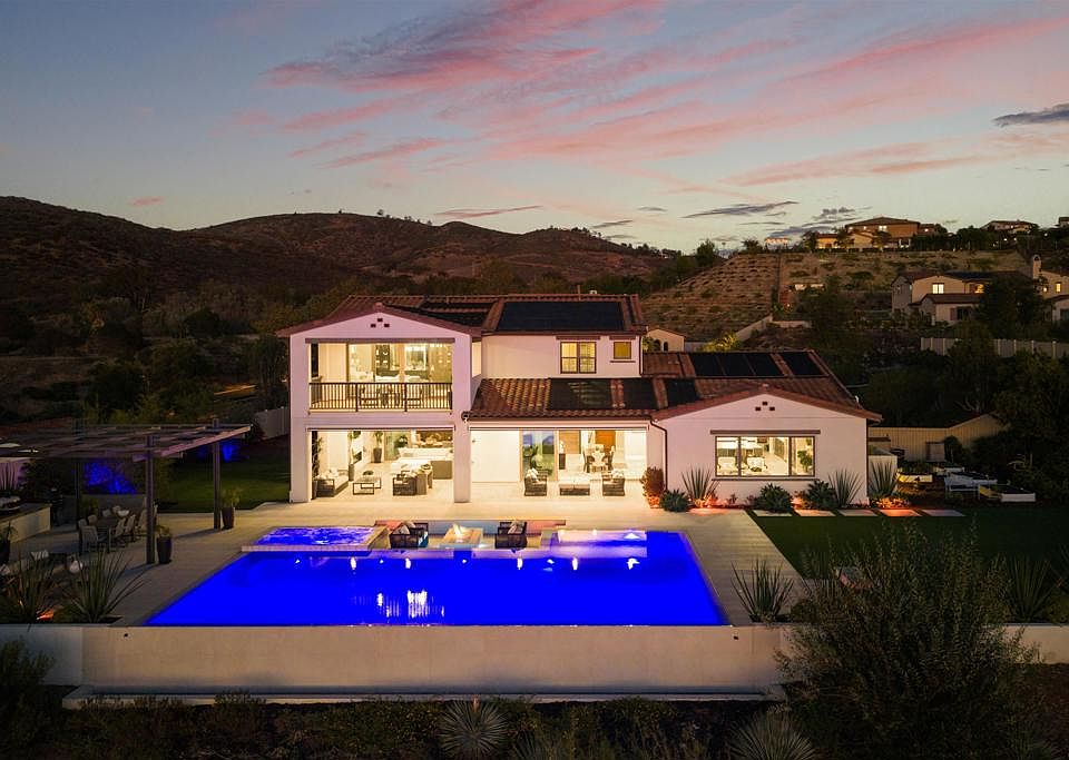 Perched above the hills in the prestigious guard-gated enclave of Sterling Heights at The Lakes above Rancho Santa Fe, this remarkable 6,063-square-foot, five-bedroom, six-bathroom estate embodies modern California luxury with breathtaking panoramic views that stretch endlessly to the horizon. As the sun sets, the sky transforms into a canvas of gold and rose tones, reflected across the striking infinity-edge pool—an unforgettable backdrop for evenings spent fireside or entertaining under the stars. This residence that served as the model home when the community was being developed, blends architectural sophistication with effortless livability. The open-concept layout flows gracefully through expansive living and dining areas designed for both grand entertaining and relaxed everyday living. The chef’s kitchen is a true showpiece, outfitted with Monogram appliances, including a six-burner dual range with griddle, built-in refrigerator and butler's pantry, all framed by elegant designer finishes that elevate both form and function. Designed for true Southern California living, the home’s multi-panel panoramic sliding glass doors open wide to a spectacular extended indoor/outdoor living space. A spacious covered patio with fireplace becomes a seamless extension of the interior, enclosed with custom motorized Neo smart blinds that transform the area into an all-season retreat. This remarkable integration allows light, air, and ambiance to flow effortlessly between spaces, creating a lifestyle defined by openness and connection. A highlight of the floor plan is the Next Gen “Home Within a Home” suite, offering the perfect solution for multigenerational living, guest privacy, or older children seeking independence. It includes a private entrance, living area, kitchenette, laundry, bedroom, and bathroom—providing comfort and autonomy while remaining connected to the main residence. The primary suite is a tranquil haven featuring a spa-like bath with an oversized shower, freestanding soaking tub, and luxurious finishes that evoke a sense of calm and rejuvenation. The outdoor spaces rival any five-star resort. The infinity-edge pool has been completely reimagined to highlight the home’s commanding views, with solar heating, LED multicolor smart lighting, and beautifully designed lounging areas ideal for both day and night. Every detail reflects thoughtful luxury, from the Sonos full-home audio system—including the courtyard—to the epoxy-coated four-car garage with built-in cabinetry and fixed overhead storage. Set within The Lakes, one of North County’s most desirable gated communities, residents enjoy the security of a 24-hour guard gate and the serenity of scenic streets surrounded by open space and mountain vistas. Just steps from the home, miles of picturesque walking, running, and cycling trails wind through the community, offering a peaceful connection to nature and an active outdoor lifestyle. Homeowners also enjoy the proximity to The Crosby Club, featuring a championship golf course, clubhouse dining, fitness center, and racquet courts. Located within the highly acclaimed Poway Unified School District, this address offers prestige, comfort, and an unparalleled lifestyle. This is more than a home—it’s a statement of refined design, natural beauty, and effortless luxury, where every sunset feels like a personal masterpiece.