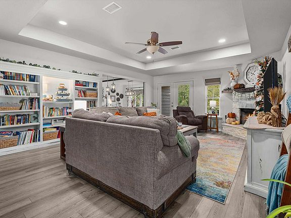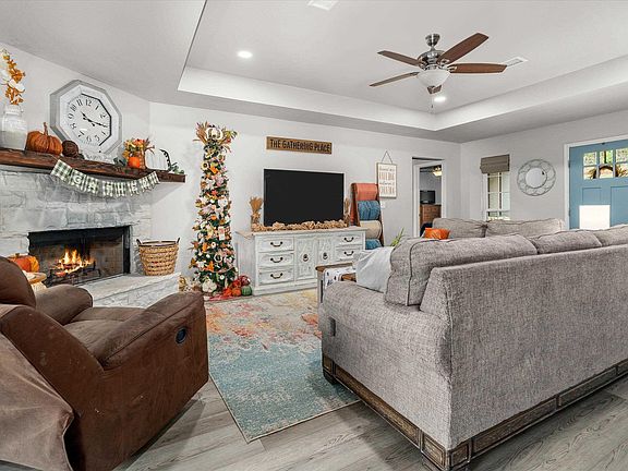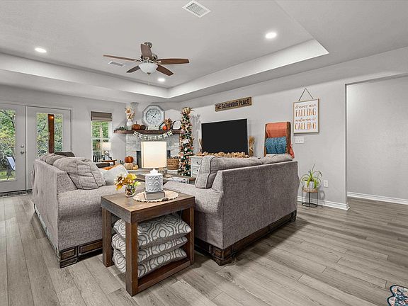 Country Life with All the Amenities! Experience the best of both worlds—peaceful country living with modern conveniences—in this beautiful home nestled on 2 sprawling acres between Jacksonville and Bullard. Enjoy easy access to schools, shopping, and restaurants while still having the serenity of rural life. Built in 2020, this home offers peace of mind with newer construction and Fidelity National Home Warranty coverage that can be continued by the buyer. Step inside to an inviting open-concept layout featuring a split floor plan with 4 bedrooms and 3.5 bathrooms—a rare find in East Texas! The living room boasts a tray ceiling, abundant natural light, and a stone wood-burning fireplace with a beautiful wood mantle. Luxury vinyl plank flooring runs throughout the home—no carpet—for easy maintenance and timeless appeal. The modern kitchen is a dream with granite countertops, a stylish tile backsplash, shaker-style soft-close cabinetry, pendant lighting, and a breakfast bar that opens to a spacious dining area overlooking the private backyard. Retreat to the primary suite featuring a spa-like en suite with dual granite vanities (including a makeup area), a garden tub with tile surround, a walk-in shower, and a large walk-in closet. Three additional bedrooms and two well-appointed full bathrooms provide plenty of space for family or guests. A flex room includes a half bath and can easily serve as a home office, formal dining room, game room or even a 5th bedroom. Additional features include a large mudroom with storage and laundry area, and a walk-in pantry. Step outside to enjoy your covered back porch—complete with a porch swing—perfect for sipping morning coffee or relaxing on peaceful evenings. An outdoor shower adds a touch of country charm and convenience for outdoor enthusiasts. Looking for even more space? Additional acreage is available from the neighboring landowner to expand your lot. This home truly has it all—don't miss your chance to call it home!