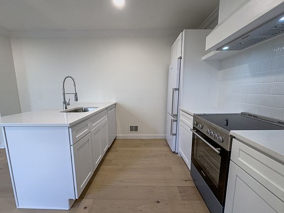 - Full chef's kitchen with white hardwood shaker cabinetry, KitKat white tile backsplash, quartz countertops, all-new high-end appliances, and peninsula seating