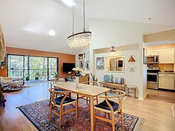Soaring vaulted ceilings and abundant natural light define this exceptional end-unit residence in Pelican Cove! Two brand new skylights (2025) bathe the interior in sunshine, creating an airy, welcoming atmosphere throughout. Step onto your private screened lanai to enjoy tranquil views of your lush landscaped backyard—your perfect retreat for morning relaxation or evening unwinding. This beautifully updated second-story 2-bedroom, 2-bath home features spacious, light-filled living areas with sleek maintenance-free engineered flooring and refined custom trim. The modern kitchen boasts stainless steel appliances and elegant Barcelona waterfall-edge countertops. Custom pleated blinds throughout the home are complemented by luxurious drapes in the primary bedroom. Curated upscale furnishings negotiable, offering a seamless move-in experience. Additional updates include: new roof (2025), AC dual capacitor replacement (2023), and Captura UVC Dual Germicidal Air Purifier with odor control (2024). Positioned on a peaceful cul-de-sac between the Pavilion and Glenhouse Pool. Pelican Cove delivers unparalleled resort-style amenities: 85-slip marina on the Intracoastal Waterway with dockside utilities, six heated pools, tennis and pickleball courts, modern fitness center, kayak launches, art studio, woodworking shop, sculpting garden, yoga, water aerobics, scenic trails, concert series featuring world-class musical performances, cinema club, culinary club, and more. Experience the gated community's tropical beauty with fruit trees, abundant bird watching, and frequent manatee sightings at the harbor. Ideally situated in South Sarasota with easy access to downtown and renowned Siesta Key beaches.