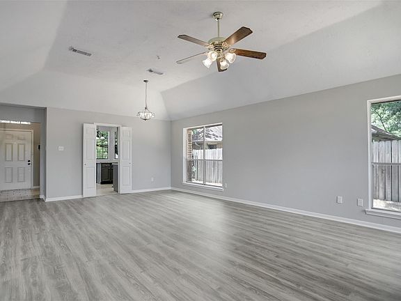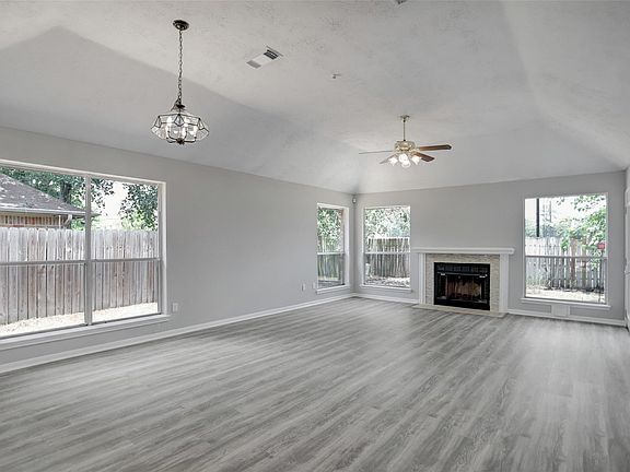 Updated, spacious home with 2 car attached garage and shady parking. Large, updated kitchen with granite counters and gas range. Breakfast bar separates kitchen from bay window breakfast area. Bright and sunny! Open-plan living and dining area with fireplace and glass doors to covered back patio. Master suite with double sinks and large shower. 2 secondary bedrooms with ceiling fans. Vinyl plank and tiled floors throughout. No carpet in this home! Utility room located between garage and hallway. Fenced back yard. Klein school district. Close to major freeways and shopping malls. No pets allowed. Agent related to landlord.
