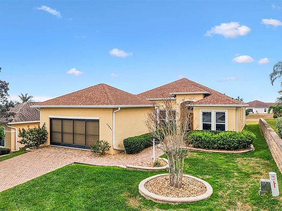 Located in the Exclusive 55+ Gated Golf Community of STONECREST, perfectly positioned adjacent to THE VILLAGES, FLORIDA, this exceptional home offers the Florida lifestyle you’ve been dreaming of! Enjoy breathtaking panoramic views spanning the 13th, 14th, and 15th fairways, an ever changing backdrop that sets this property apart. From the moment you arrive, it’s clear this home will not disappoint. Thoughtfully built with CONCRETE/BLOCK/STUCCO construction, the home Features 2 Bedrooms plus a versatile DEN, along with Formal Living and Dining rooms and a spacious FAMILY room ideal for entertaining or relaxing. 10 and 12 FOOT CEILINGS enhance the open feel, while TILE Flooring throughout adds both elegance and easy maintenance. Major updates include NEW ROOF (2020), NEW WINDOWS THROUGHOUT AND NEW SLIDING GLASS DOORS in Family room and Primary Suite (2021). Furnishings may be purchased separately. Stonecrest offers an unmatched resort style lifestyle with multiple clubs and activities, four pools, a spa, softball field, dog park, bocce ball, tennis and pickleball courts, and championship golf. With golf cart access to shopping, dining, and medical facilities, convenience is part of everyday life. If you haven’t experienced all that this vibrant community has to offer, now is the perfect time to visit and fall in love.