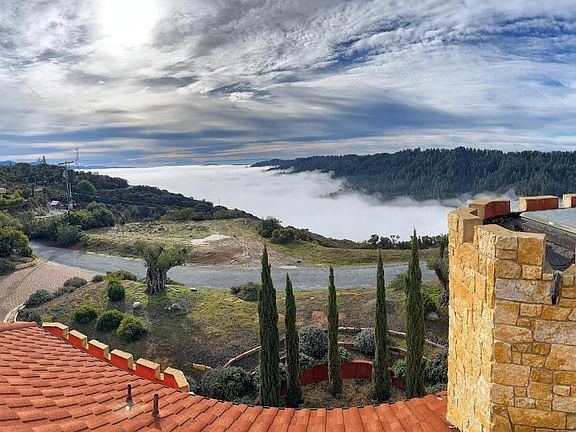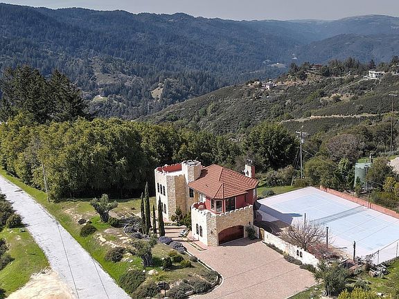 Luxury inside-outside living on a top of the hill! Beautiful custom home, castle inspired, on 2 acres of well-maintained grounds in 10-minute drive from downtown Saratoga. One of the most scenic roads in California, with views getting better when getting higher. Tennis court, mature Vineyard and vegetable garden; built-in grill; pizza-oven; water well-"free water". Magic of ancient olive trees and the Bay Laurel tree forest, mature Kwanzan Sakura and Red Dragon Japanese maple. Two story 2007 built 4 bdr 2.5 bath 2918 sq ft house with attached oversized 2 car garage features hardwood floors all around and artistic details. On the ground floor there are chefs kitchen, spacious dining room with adjacent wine room; office/bedroom, living room with a wood burning fireplace and exits to the backyard; a 1/2 bathroom. Elegant stairway leads to the second floor. There are the large family room/library; a master suite, two additional bedrooms; full bathroom and a laundry room. Relax in a hot tub on a roof top terrace. Plenty of parking space in the driveway. Enjoy views of the hills and canyons, of San Francisco and Monterey Bay Peninsula, the hiking trails of El Sereno Open Space Preserve and Sanborn Park. Excellent Saratoga schools. Must see in person to truly appreciate the beauty!