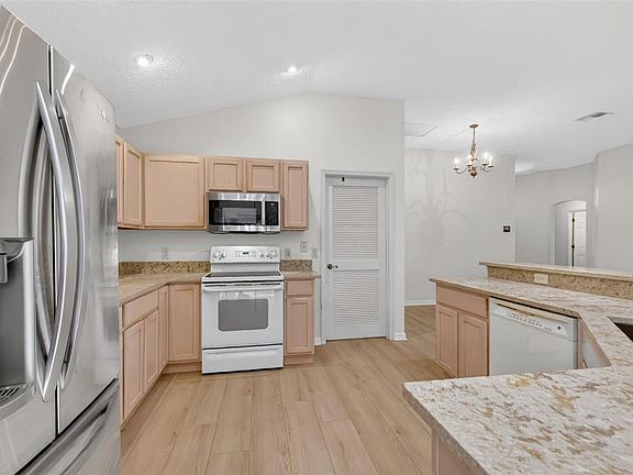 GORGEOUS 3/2 RARE Ligustrum Model, nestled within a QUIET CUL-DE-SAC on a LARGE PRIVATE LOT in the highly desirable Village of Woodbury! LOW BOND - only $1,389! ROOF (2019), HVAC (2019), HWH (2020). STATELY oaks and MATURE landscaping with CURBED edges; PAVER drive and walkway; COVERED entry vestibule; and a front door with built-in blind, retractable screen, sidelight, and transom window welcome you in to a well-lit and generous foyer boasting HIGH CEILINGS a convenient ENTRY CLOSET. UPGRADES include FRESH interior paint and SEAMLESS, LIGHT WOOD-GRAIN LUXURY VINYL PLANK THROUGHOUT the ENTIRE home! The AMAZING kitchen boasts WOOD cabinetry with PULL-OUTS, GRANITE countertops, built-in PANTRY, and a convenient EAT-IN breakfast bar. Adjacent to the kitchen, the dinette area, with its VAULTED ceiling and ample windows invites natural light. The EXPANSIVE OPEN CONCEPT living and dining area features HIGH CEILINGS creating a SPACIOUS and voluminous main living area - perfect for gatherings and entertaining! From the living room, sliding glass doors invite you in to the SPACIOUS 23’ x 8’ lanai overlooking the LARGE rear yard surrounded by mature landscaping, creating abundant PRIVACY! There’s also a side PAVER patio for grilling or simply enjoying the beautiful Florida weather! Back inside, an arched doorway leads you to the primary bedroom boasting a VAULTED ceiling, abundance of windows, sliding glass doors to the lanai, and a generous WALK-IN closet. Its en-suite bathroom features WOOD cabinetry, TILED WALK-IN shower, and a LINEN closet. Two additional bedrooms and a second bathroom are conveniently located near the front of the home ensuring plenty of PRIVACY for guests or a quiet home office. Bedroom two features large double windows and TWO built-in closets. The second bathroom is well-appointed with a WOOD vanity, TILED tub and shower combination, and a hallway LINEN closet. The third bedroom offers double windows and a built-in closet. Just off of the kitchen, an INTERIOR laundry room features a utility sink and shelving and leads to the two-car garage offering pull-down stairs with attic access, workbench, and additional STORAGE shelving. DON’T MISS THE OPPORTUNITY TO MAKE THIS INCREDIBLE HOME YOUR OWN! The Village of Woodbury is IDEALLY LOCATED close to Nancy Lopez Legacy Country Club and Championship Golf Course; Glenview Country Club and Championship Golf Course; Mulberry Grove Recreation Center; First Responders Recreation Center; First Responders Pitch-N-Putt Golf Course; Springdale Fitness and Walking Trails; Mulberry Dog Park; and Hwy 441 and CR 466, offering an abundance of shopping, dining, banking, medical, and more! PLEASE WATCH OUR WALKTHROUGH VIDEO of this FABULOUS HOME and call today to schedule your Private Showing or Virtual Tour!
