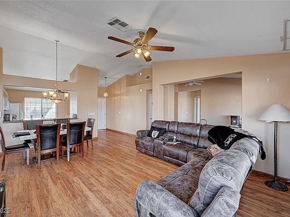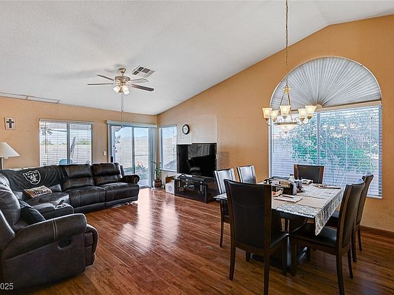 Welcome home to this charming single-story residence, situation on a large, elevated corner lot in Hidden Canyon. This home features 2 bedrooms + den (easily can be converted to a third bedroom, 2 baths, 2-bay garage, vaulted ceilings, laminate wood and tile flooring throughout, living area, spacious kitchen with breakfast nook, ceiling fans throughout, large backyard with full-length covered patio, low maintenance landscaping, security gate, water softening system, and fully-owned solar to transfer to buyer at no additional cost. Conventionally located near local shopping and retail, the I-11/95 and I-15, and Cheyenne Ridge Park.