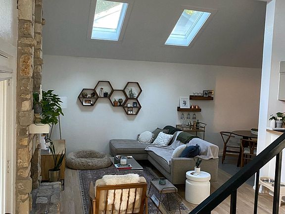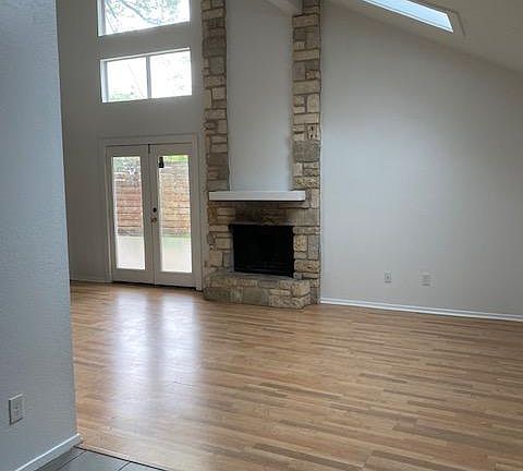 Duplex lives like a single family home-No Common Walls! Conveniently located to many South Lamar popular venues and bus stop. Quiet location, set back from the street with a creek nearby. Privacy fenced backyard with no direct neighbors making this a great area for entertaining with artificial turf and large deck area. Upstairs has a large master bedroom, walk-in closet, bath, outdoor balcony and a loft area that could used as a small office. 2nd bedroom and bath is downstairs. Living area has a vaulted ceiling and fireplace . All kitchen appliances are included. Indoor washer and dryer is also included. 2 reserved parking spaces, 1 is covered. Additional street parking is available.