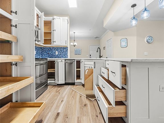 This two bedroom, Angler floorplan, has been nicely updated, with additional kitchen storage. A complete list of the sellers' upgrades can be found under the documents, but just to name a few, LVP flooring, new custom cabinets and Quartz countertops, and cabinets added to the laundry room. The kitchen countertop was leveled to allow for counter stools and island seating. Included in the listing price is the garage, with automatic garage door opener, located right next the the condo. Should you not want the garage, but why wouldn't you, it can be sold separately, as these are in high demand. New water heater and HVAV 2022.
