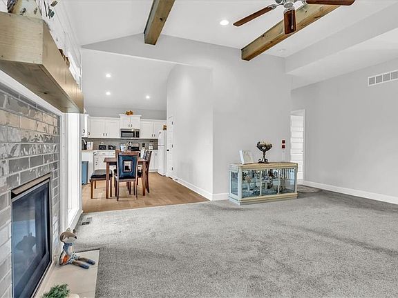 Step inside to a stunning great room featuring vaulted ceilings, exposed wood beams, and a cozy fireplace — the perfect gathering space. The kitchen boasts granite countertops, a pantry, and gorgeous wood floors, blending function and style.