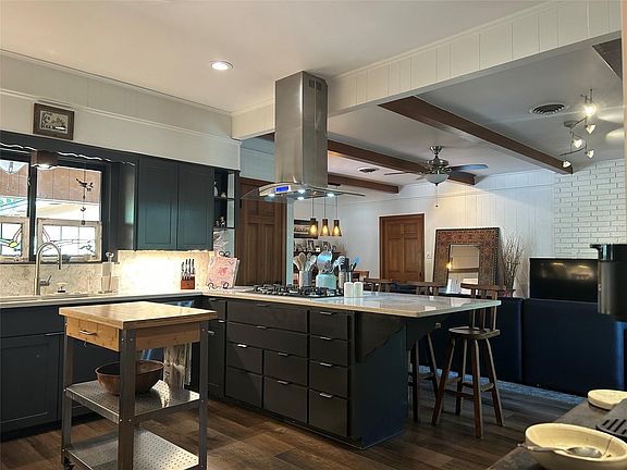 Mid-century modern home featuring 9-foot ceilings, an updated kitchen, exposed beams, and refined finishes. Stroll to the downtown square or relax on the covered porch. The property is adorned with a majestic 100-year-old oak and three pecan trees. Solid wood 6-panel doors and distinctive details enhance this timeless gem. Come make it your home! Appointment only, dogs on property, owner agent