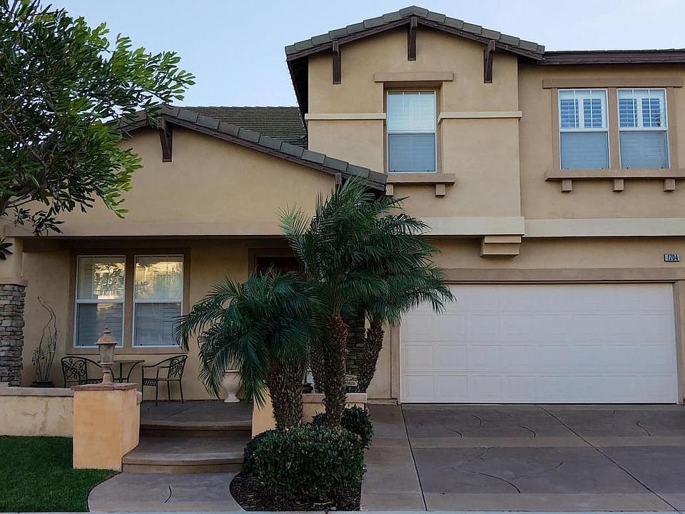 This 3,112 sq-ft home with 7 bedrooms and 3 bathrooms has several upgrades throughout. Front exterior with mature landscaping including palm trees and shrubs, stone and lighting accents, stamped/stained concrete driveway and covered patio. Entry leads into the formal living and dining room with large alcoves, interior balcony overlook, vaulted ceilings and high windows providing great lighting. Spacious kitchen includes granite counters and full back splash, center island with bar overhang, stove top, built-in microwave, dishwasher and new double oven. Family room with media alcove and fireplace, guest 3/4 bathroom with shower and two downstairs bedrooms. Long wood rail stairway leads into the second floor landing with linen cabinets, secondary bathroom with dual sinks and tub/shower, four generous sized bedrooms including one with built-in desk, cabinet and shelves.Down the hall leads into the huge master bedroom, dual closets with custom closet organizers, master bathroom with separate tub and shower, dual sinks and vanity. Backyard with stamped/stained concrete, stone and lighting accents, built-in BBQ and mature landscaping including palm trees and shrubs. Other features include indoor laundry with sink, 2 car garage and tank-less water heater.