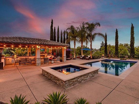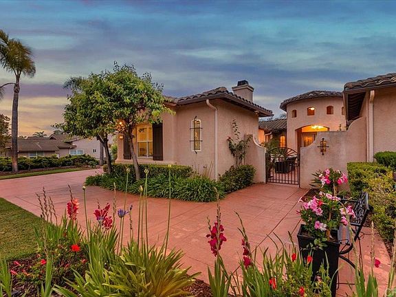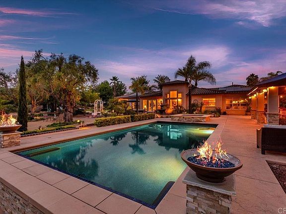 Welcome to your dream home! Located in the highly coveted and rarely available community of Victoria Ranch, this SINGLE STORY POOL HOME w/ OWNED SOLAR sits on over an acre and offers a truly elevated indoor-outdoor living experience. Designed for both everyday comfort and effortless entertaining, the home opens with a welcoming entry courtyard featuring an outdoor fireplace. This desirable 3577sqft floorplan features 3 bedrooms plus office (4th optional bedroom with ensuite bath) 3.5 baths, utility/ hobby room and 3 car split garage. The primary bedroom with additional retreat offers a cozy fireplace, french doors to the backyard and spacious en-suite bath with trsavertine walk-in shower, dual vanities, soaking tub and large walk-in closet. Interior upgrades include 10’ ceilings, vaulted entry, french doors throughout, large walk-in pantry, dual-zone HVAC, central vacuum system, multiple fireplaces, solar tube lighting and upgraded flooring. Equipped with an owned solar system of 15 panels and water-wise irrigation system to minimize utility costs. The true centerpiece of the home is the one of a kind outdoor space—your private California paradise. The spacious custom dining pavilion serves as the heart of the backyard, complete with an outdoor kitchen, fireplace and lounge area with TV, ceiling fans, and designer finishes. The saltwater pool and spa invite relaxation with dark pebble tec plaster, abalone shell finish, Baja shelf, and an electric safety cover with keypad access. The bocce ball court, putting green and play-structure are perfectly placed amidst the botanical garden retreat. The 100 year old olive trees, a citrus grove, rose garden and meditation area complete the setting, offering peace, privacy, and year-round enjoyment. An exceptional opportunity to own a rarely available home that brings together elegant interiors and a true outdoor oasis in one of North County’s premier communities. Victoria Ranch enjoys being a part of the Twin Oaks community, a serene neighborhood nestled in the rolling hills of San Marcos. Its natural surroundings provide ample opportunities for outdoor activities including the nearby Twin Oaks Valley Golf Course, local parks, extensive trail systems for hiking, biking and horseback riding. Close proximity to major freeways, shopping, hospitals, restaurants and newly developed North City in San Marcos. Seller to select services. Room dimensions & sq footage are approximate, per builder & assessor's record. Mello-roos is estimated.