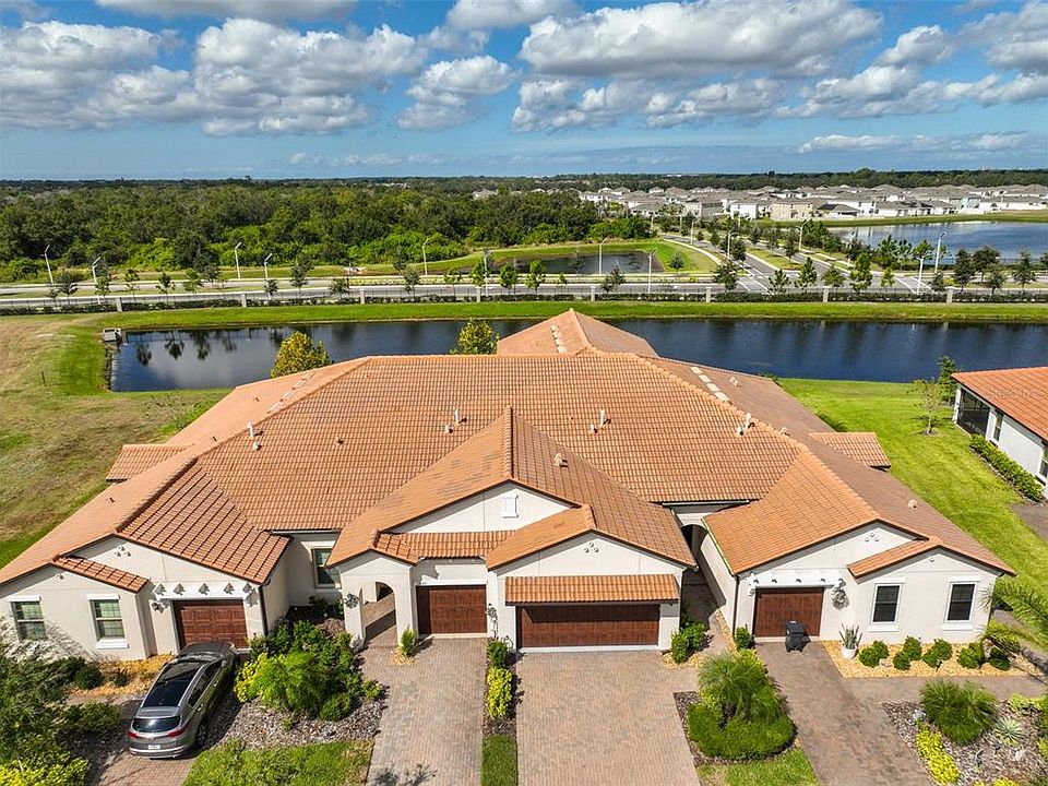 Situated on a pond tucked away in a peaceful cul-de-sac this 2 bed, 2 ½ bath, 2 car garage Villa in a prime position, boasts an unrivaled outlook of brilliant sunsets and abundant birdlife. Relax on the screened lanai with brick tile flooring and newer blinds, perfect for taking in the peaceful pond views that enhances the home’s serene setting. Located in a desirable 55+ active community, this spacious 4-block Villa offers comfort, style, and peace of mind. Enjoy newer high-impact windows (2024) on the upper level, Gas Water Heater, Carrier 2-ton A/C (2022) for year-round efficiency & a Kinetico water softener. The kitchen features elegant stone countertops, a gas range, breakfast bar, and reverse osmosis system for pure, great-tasting water. The primary bedroom is conveniently located on the main level, with 1.5 baths for added functionality. The second level includes a bedroom with murphy bed, a second bath and a sizeable loft area. Additional features include an alarm system with keypad & phone connectivity for enhanced security, and EV charger in garage. Experience low-maintenance living in a scenic, friendly community—the perfect blend of comfort, convenience, and natural beauty. Medley at Southshore Bay in Wimauma, FL is a vibrant 55+ gated community that features a clubhouse with large ballroom including a stage and projection facility, a games room with billiards, a café and bar, fully equipped fitness center, and a resort-style pool with outside bar. Six pickle ball courts, three bocce ball courts and available for the more sports inclined residents. Frequent social events are arranged by community management & the many resident clubs. Two dog parks are available for dog owners, Further info. on Southshore Bay is available at Home–Medley Southshore Bay. Directly opposite the Medley complex is the Southshore Bay Lagoon, a 5½ acre lagoon complex that features swimming, kayaking & paddle boarding activities. A bar overlooks the pool area with food available. Movie nights & performers are routinely arranged as are Holiday celebrations. Medley residents enjoy preferential access to the lagoon complex. For more info visit the website: Southshore Bay Lagoon-MetroLagoons.