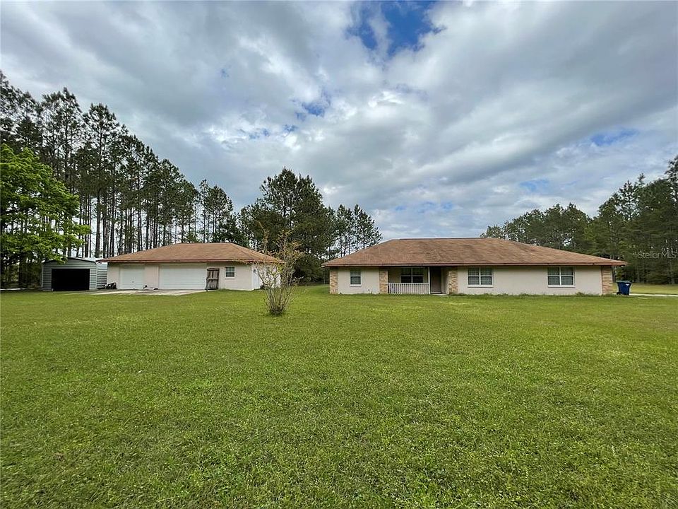 Back up offers accepted! Looking for a detached 3 car garage or workshop on 12 plus acres? If that got your attention, read on! This 3 bedroom (plus flex room/office) 2 bath 1948sf concrete block home in Alachua has over 12 acres for you to enjoy. The spacious great room has vaulted ceilings and leads to the dining area. The kitchen has tons of cabinets and long counter tops on both sides. There is a flex room area and inside laundry room (with a sink) right off the attached 2 car garage. The large primary bedroom has an on-suite bath with a big walk-in closet. The home has a 2 car garage plus an additional detached 3 car garage that is 28x48 (1,344 square feet) with tall garage doors for SUV or boat and plumbing for a bathroom. There is also a detached, enclosed metal carport. NO HOA or deed restrictions. Alachua electricity and Alachua city water. Motivated seller!