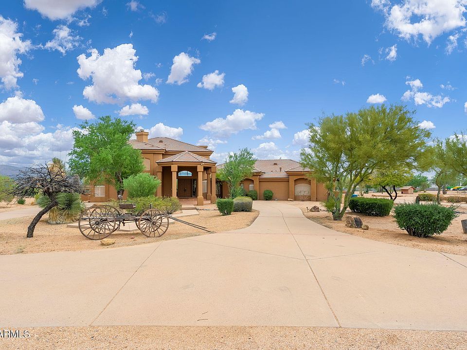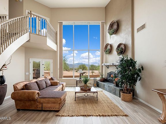Discover this private western retreat tucked into Rio Verde, offering breathtaking views of Four Peaks and surrounding mountain ranges from every angle. Situated on 10 acres, this well-appointed estate boasts 4,267 SF of living space with soaring ceilings and a thoughtful floorplan. Three bedrooms are located downstairs, while the primary suite upstairs features stunning mountain views and a private balcony overlooking the expansive property.