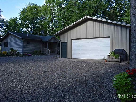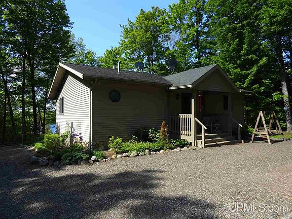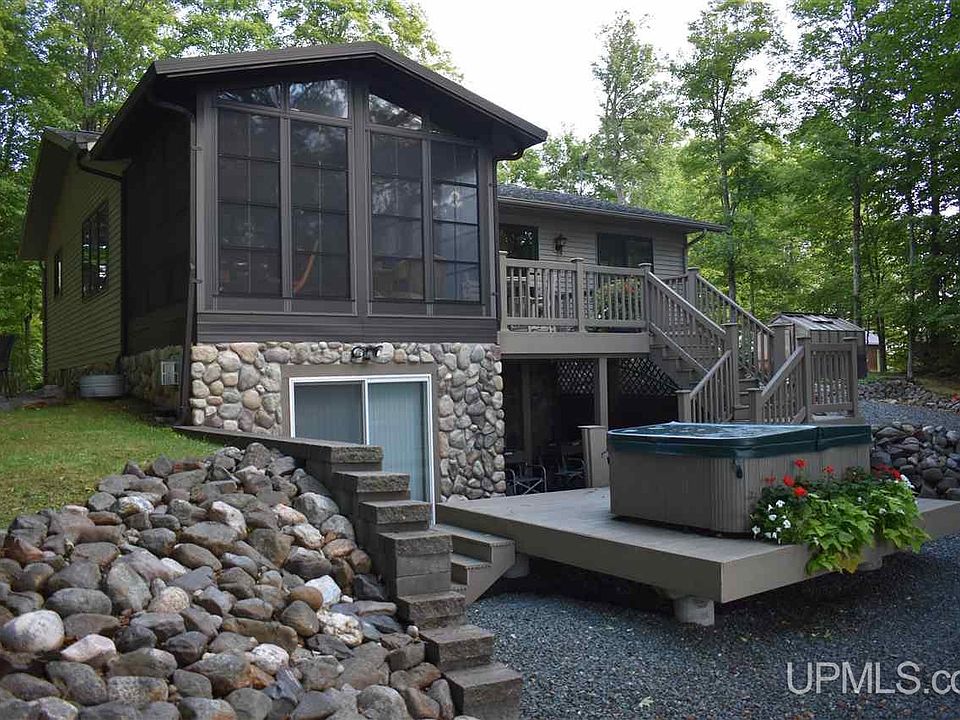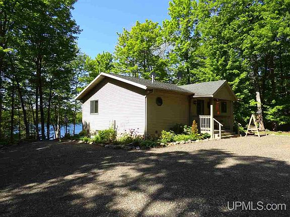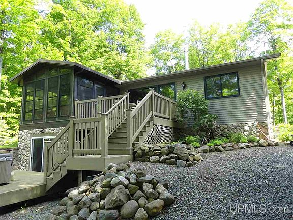 Over 250 feet with 1.4 acres on Lake Michigamme located at the end of Silver Road lying on the south side of a point with east south/east facing sunrise views. This turn key property sits on a high ridgeline with easy stair and drivable trail road access to a large flat area that is lakeside. Awesome lake access with small gravel bottom that is in a fairly protected bay which is key on this massive and sometimes rough inland lake. The home has a main bedroom with large closet, full bath and laundry on the main level. A beautiful three season room with large attached deck provide awesome lake views. The kitchen, living and dining room all flow together and have lake views as well. The walkout basement has two standard bedroom with an additional non conforming bedroom and an office or craft room. There is a 3/4 bath along with a bar area and living room which directly access the lower patio which contains a hot tub. A large detached garage and greenhouse complete the buildings. The entire parcel has wonderful landscaping, flower beds, and viewing/sitting areas. There is trex decked stair leading down the ridge to the lake. An ATV or golf cart could easy drive down the path also. This is technically seasonal access but the Sellers have and a few neighbors still do plow and live hear year round. Whether a summer cottage or your new full time home, this property is outstanding in every way. Showing can start June 16th. Any/all offers to be submitted by 6/24 at 12pm.