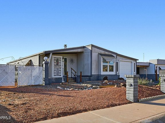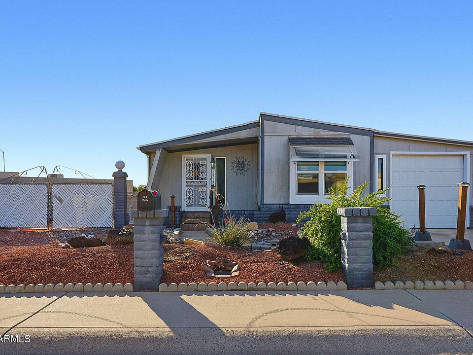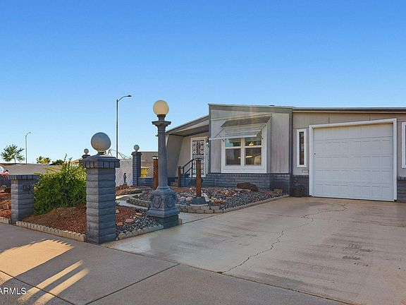 Come see this charming home in the desirable Casa Campana 55+ community. One of the few homes offering its own private extended garage! This well- maintained residence features a bright Arizona room perfect for relaxing or entertaining. Enjoy plenty of outdoor space with an extended yard- ideal for evening gatherings. Inside, you'll find two spacious bedrooms, including a primary suite with a walk-in closet and electrical outlet. Additional highlights include double-pane windows with roll-up blinds, and ceiling fans in every room. Conveniently located minutes from Arrowhead mall, shopping centers and grocery stores.
