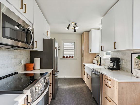 This adorable fully updated bungalow is in the perfect location and features an extra-large 2 car detached garage. In 2022, it underwent a full renovation that included an updated kitchen with contemporary features. You will LOVE the charm of the updated bathroom. Other updates include a 6-foot vinyl privacy fence that surrounds the backyard (2022), a new roof added in 2023 and a new dryer in 2024. The large front deck had new rungs and deck lattice put on in 2024. Blinds were added in 2022 and the garage door was replaced in 2024. The basement has a large living area and a cute non-conforming bedroom or workout room. You will absolutely love living in this charming home close to shopping and restaurants. All information obtained from seller and public records.