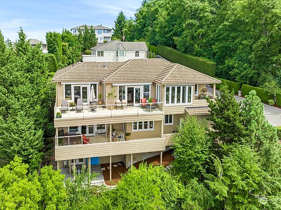 Welcome to VILLA VISTA. Located on a quiet, tree-lined private drive, this luxurious boutique estate has 180 DEGREE, UNOBSTRUCTED, PANORAMIC, WATER, MOUNTAIN, CITY, AND SOUND VIEWS. Soaring ceilings in entry welcome you into the open, flowing floorplan. Good morning w/ windows galore & tons of natural light. 2 expansive view decks to relax and take in the amazing views. Gourmet Kitchen w/ island, SS appliances, Sub-Zero, walk-in pantry, butler's pantry, patio off kitchen, and built-ins. Great Room has luxurious bar & kitchenette. The 1700+ bottle temp-controlled wine cellar is pure WOW! Great location in entryway for home elevator. Flex Room on lower can convert to 4th bedroom. 2 HVACS & Central A/C. Fully fenced back area. RV/boat parking.