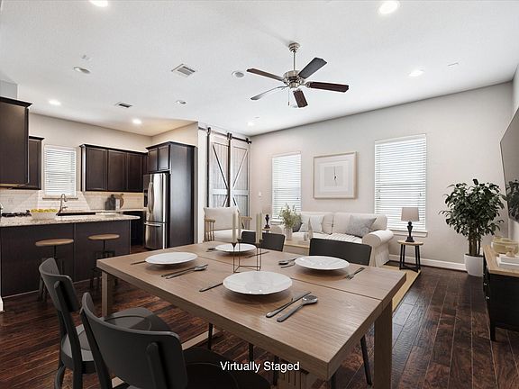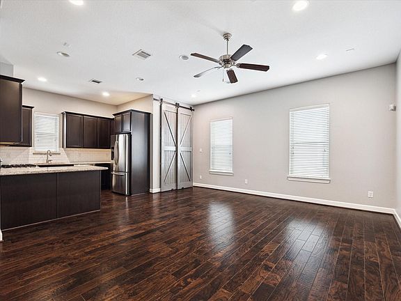 The stylish kitchen features a decorative sliding barn door pantry that opens seamlessly to the family room—perfect for entertaining. Refrigerator, washer, and dryer are included with the purchase.