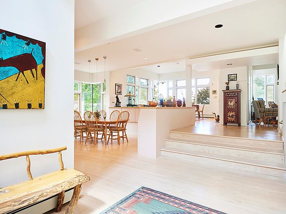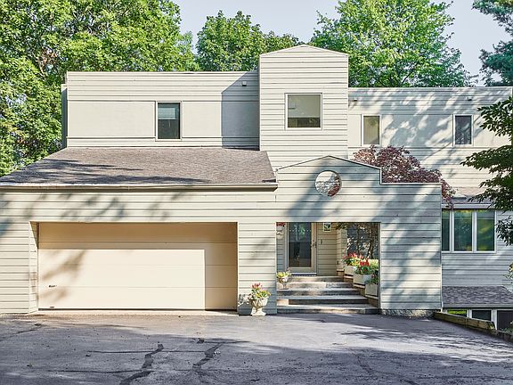 Fabulous contemporary on hillside of Lake Shore Drive. High ceilings, expansive windows, hardwood floors, bright open living areas with an elegant yet casual flair. Two enclosed porches to enjoy Lake breezes and a good book. Walk out lower level to patio and beach shower. Main floor laundry, generous storage. Back yard offers generous parking and lovely gardens. Designed by Jerry Hyndman, the home offers quality throughout.