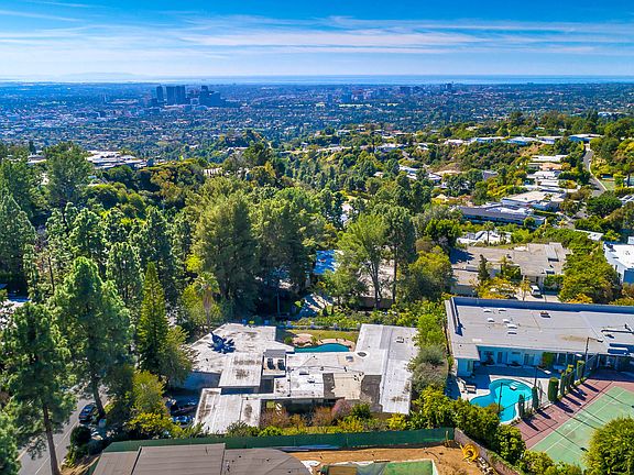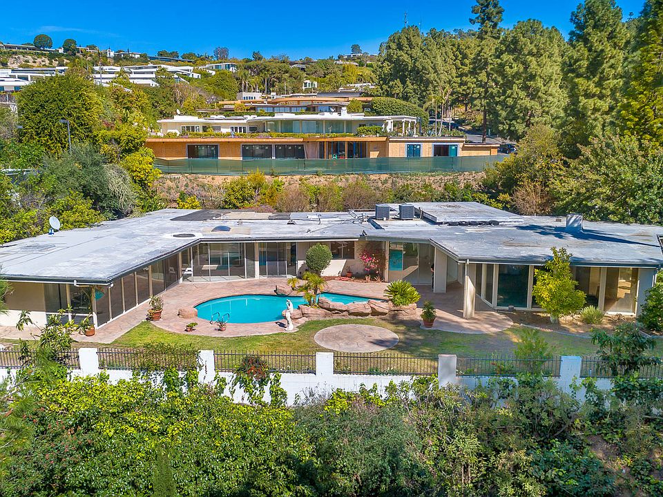 Prime Trousdale gated property on a premier corner lot with large motor court and very generous flat pad with complete privacy and views of city. One story home has open floor plan with great potential to do a light remodel. The grounds include a swimmers pool and expansive lawns and gardens. This home is a sought after mid century contemporary style, light, bright with incredible indoor- outdoor flow