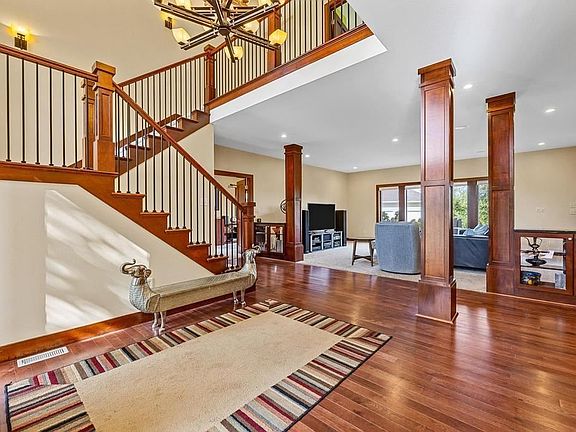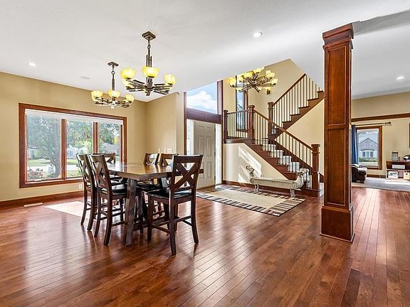 This stunning 2 story in Robins is sure to impress – over 6,000 square feet backing to the pond!! Step into the two story foyer with hardwoodflooring and woodworking which opens to the great room and formal dining. Just past the great room is the chef’s dream kitchen completewith quartz countertops, center island, breakfast bar, professional line GE appliances, under counter beverage fridge. Off the kitchen is thedaily dining area and cozy seating area with gas fireplace, built-ins, and sliding glass doors to the maintenance-free deck. The main level also features an office off the great room, half bath, and mudroom with large pantry that is also plumbed for washer/dryer if you prefer main-level laundry. Retreat to the spacious primary suite on the second level, complete with plenty of closet space (3 closets total including a walk-in!)and en-suite bath with dual vanity with linen tower, corner tub, and tile shower with jets. 4 additional bedrooms (one with vaulted ceilings), 2additional full baths (one jack-and-jill style), and laundry room with shelving complete the second level. The walkout lower level offers plenty of space to entertain/enjoy in the spacious rec room with gas fireplace and adjoining wet bar with wine room, plus sliding glass doors to the beautiful paver patio with gas fire pit, seat wall, and pond views!!