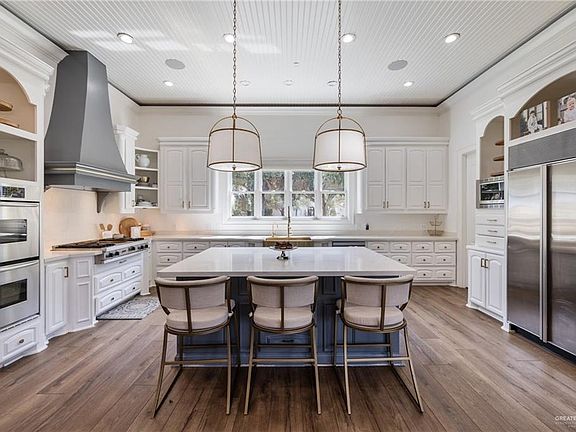 Exquisite Estate in the exclusive gated Oakland Subdivision. Situated on nearly 2 acres, this breathtaking custom home is designed for comfort, elegance, and entertaining. Completely remodeled in 2021 with modern updates and timeless style. Step inside to find remarkable craftsmanship from custom cabinetry and coffered ceilings to designer lighting. The chef’s kitchen opens to spacious living areas, perfect for gatherings or quiet evenings by the fireplace. Primary suite offers a peaceful escape with a spa style bath, dual vanities, oversized shower, and private sauna. Additional highlights include a home office with custom wood built ins and spacious secondary bedrooms. Detached maids quarters. Outdoors, enjoy a resort style pool and spa, covered outdoor kitchen, pool house, and lounge areas. For recreation and wellness, the estate features a 6000 sq ft indoor basketball/volleyball court, with professional maple hardwood, and a state of the art fitness center. Zoned to Sharyland ISD.