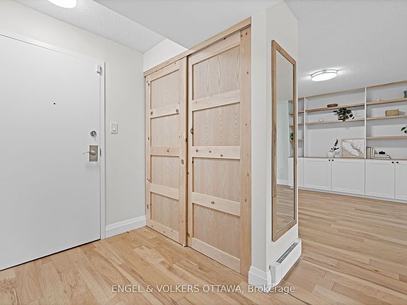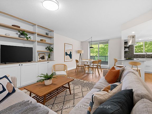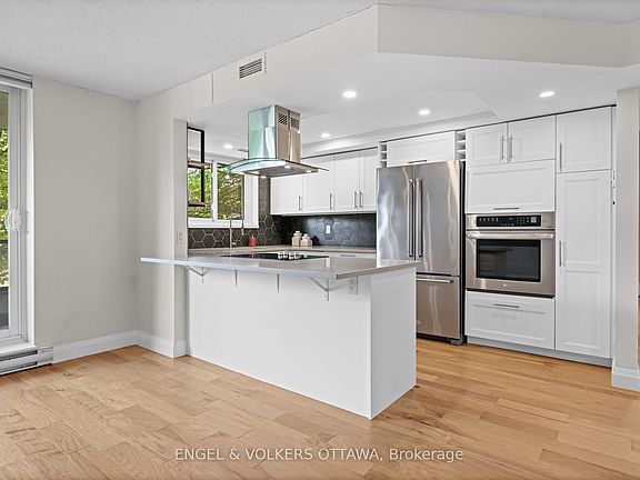 Step into this beautifully updated 2-bedroom, 2-bathroom condo, where modern finishes and functionality come together effortlessly. The spacious, open-concept living area is filled with natural light and features rich engineered hardwood floors, seamlessly flowing into the fully renovated kitchen. Equipped with stainless steel appliances - including built-in wine storage, the kitchen boasts recessed lighting and striking quartz countertops. The dining area, conveniently located off the kitchen, is perfect for family meals or entertaining, with sliding glass doors leading to a balcony with views of lush greenery. The generous primary bedroom features a walk-in closet and a fully updated 4-piece ensuite with a tub/shower. The second bedroom offers ample closet space and a bright, inviting atmosphere, ideal for a home office or personal gym. A second 4-piece bathroom and a laundry closet with a stacked Whirlpool washer and dryer complete the space. This condo is perfect for young professionals or downsizers, located just minutes from downtown Ottawa with easy access to major roads, shopping, dining, and beautiful parks and walking trails. Don't miss the opportunity to make this thoughtfully renovated home yours!