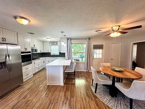 The bright, modern kitchen features white cabinetry, gorgeous quartz countertops, newer built-in stove, range, microwave, and brand new refrigerator & dishwasher—all included! Just off the kitchen, you’ll find an incredibly spacious dining area, perfect for entertaining family and friends.
