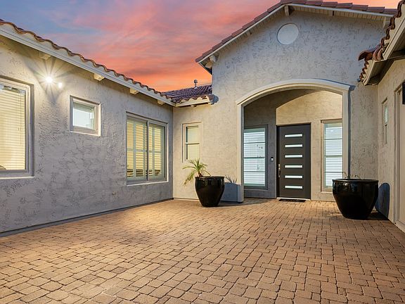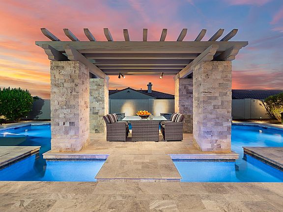 This is an entertainer's dream and a rare opportunity for modern luxury living! As one of the largest single-level floor plans offered in the area, this stunning 4,342 SqFt home blends flexible living with stylish upgrades and a truly one-of-a-kind lifestyle. Currently configured as a 4 bed / 3.5 bath, the layout also features an open bonus room, separate office/den, and enclosed bonus room, all of which can be easily modified for up to 7 bedrooms. Inside, you'll find a crisp modern renovation with white and grey tones, a chef's kitchen w/ unique ''T'' island, stainless appliances, double ovens, quartz counters, and sleek pendant lighting. Every bath has been updated with new tile, fixtures, etc. The expansive owner's suite includes a re-imagined bathroom, dual walk-in closets (one was added w/ a garage reconfiguration). Outside, the resort-style yard is sure to wow family and friends! The refinished pool with stone water features surrounds an "island" platform shaded by a pergola, creating an outdoor living experience you won't find anywhere else. You'll appreciate dual garages offering 3.5 spaces. You'll save year 'round with the efficient solar system plus EV charging station.